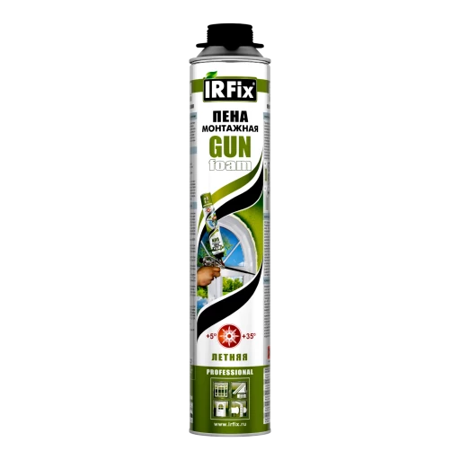 Высококачественная однокомпонентная полиуретановая монтажная пена летнего применения IRFix GUN в аэрозольной упаковке 750мл. Используется с применением специального монтажного пистолета.