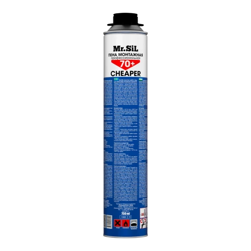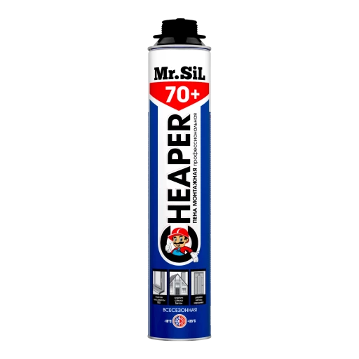 Высококачественная однокомпонентная полиуретановая монтажная пена всесезонного применения Mr.Sil CHEAPER 70+ в аэрозольной упаковке 750мл. Используется с применением специального монтажного пистолета.