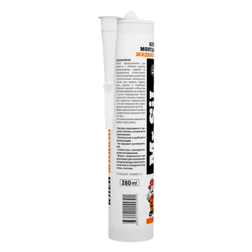 Применяется для монтажа потолочного декора, а также стеновых и потолочных панелей из вспененных пластиков на различные основания (бетон, оштукатуренная поверхность, цементная стяжка, кирпичная кладка, дерево, ДСП, ДВП, фанера, гипсокартон и т.п.). Предназначен для внутренних работ.